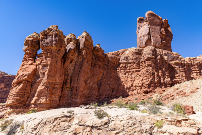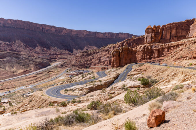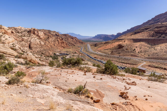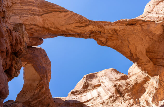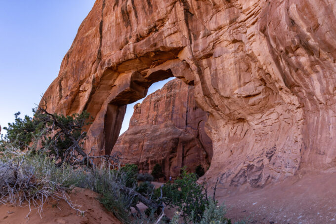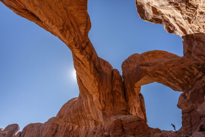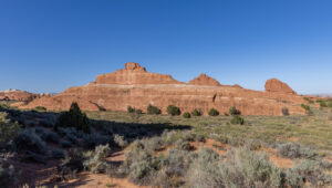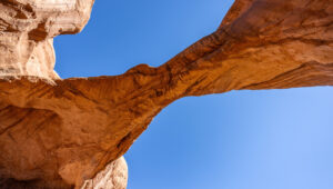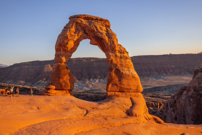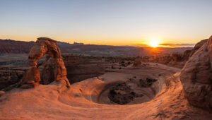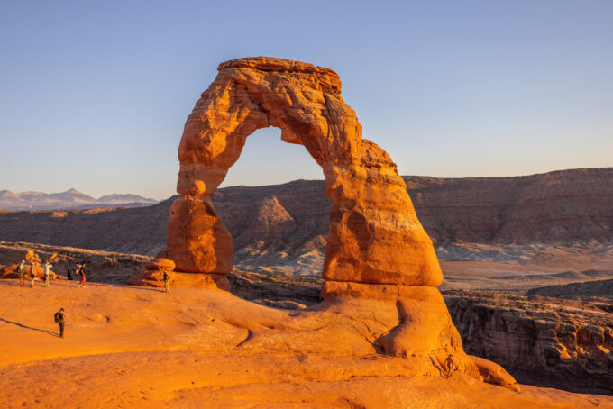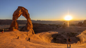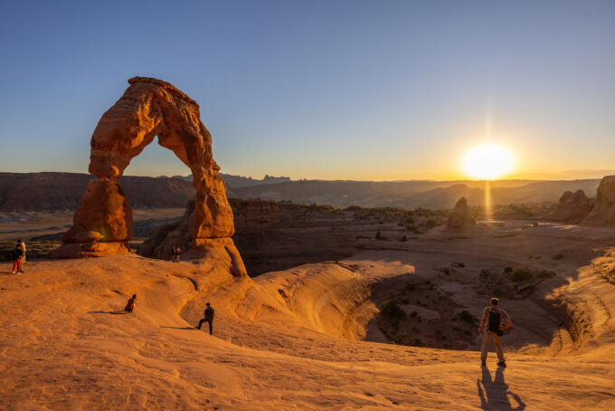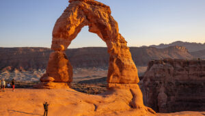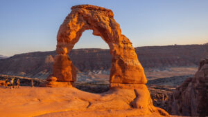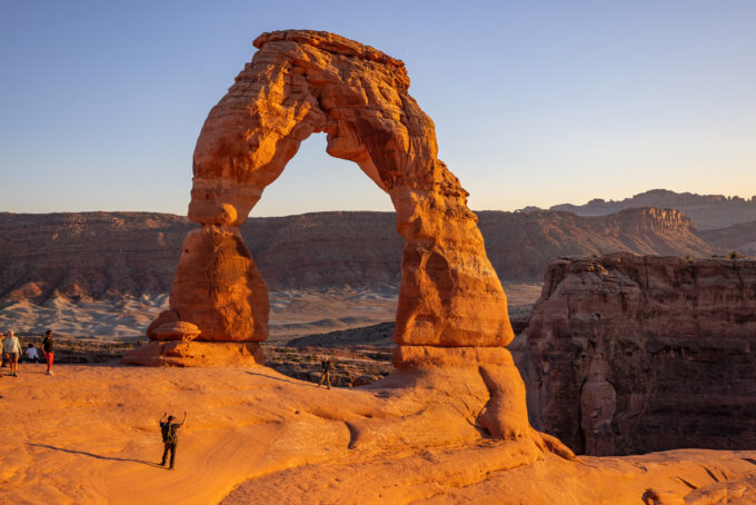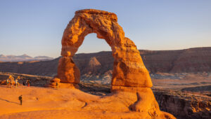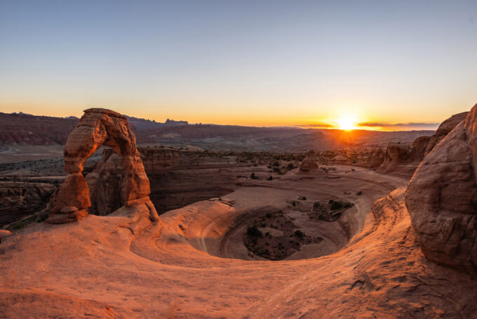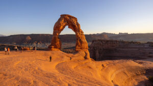 - Delicate Arch (3,2 km w jedną stronę): najbardziej znana ikona parku. Szlak prowadzi po płaskich, łagodnie nachylonych piaskowcach; na wschodzie o poranku łuk przybiera ognisty odcień czerwieni.