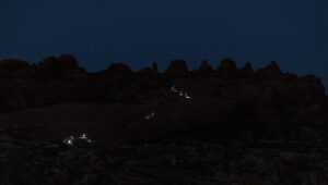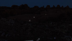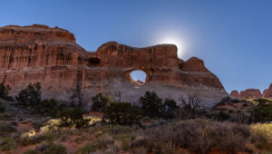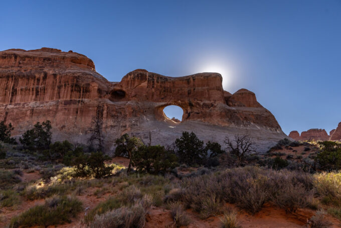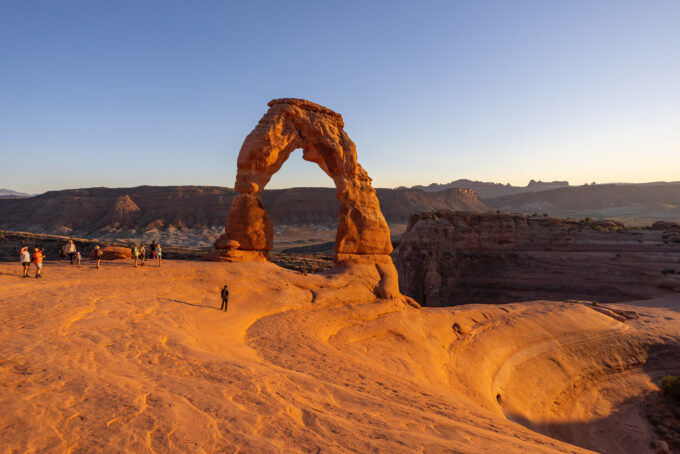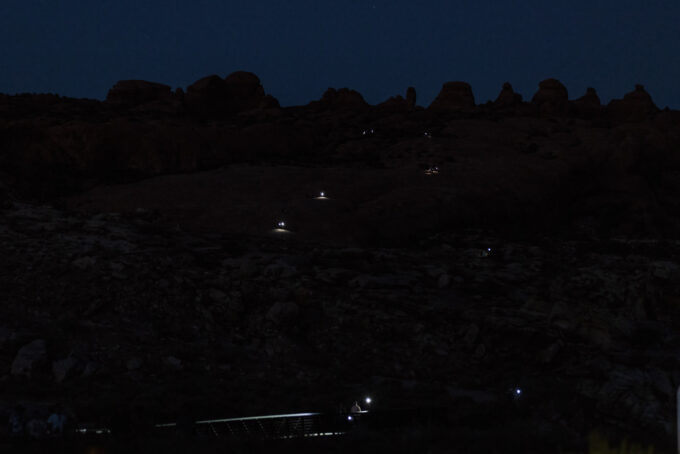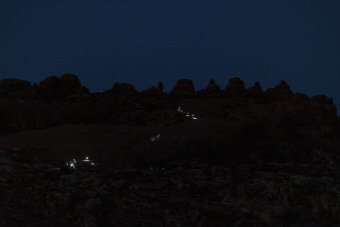Zachód słońca przy Delicate Arch to spektakl – ciepłe światło padające na łuk i panoramę za nim tworzy niezwykłe kadry. To był nasz ostatni punkt zwiedzania parku i zdecydowanie była to najlepsza możliwa decyzja. Po zmroku niebo jest niemal wolne od światła sztucznego: pas Drogi Mlecznej przecina kopułę na tle czerwonych grzbietów. To obowiązkowy punkt każdego planu. Warto zabrać latarkę na powrót. Po zachodzie słońca niemalże natychmiast robi się ciemno i powrót do samochodu robi się odrobinę niebezpieczny. Trzeba naprawdę uważać, żeby nie skręcić nogi.
