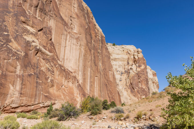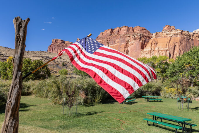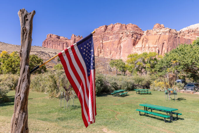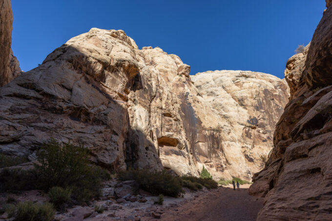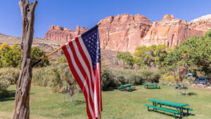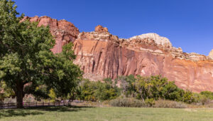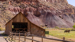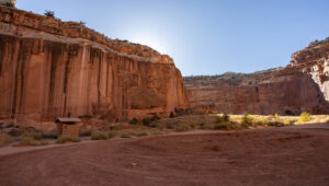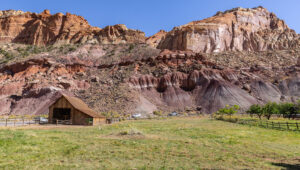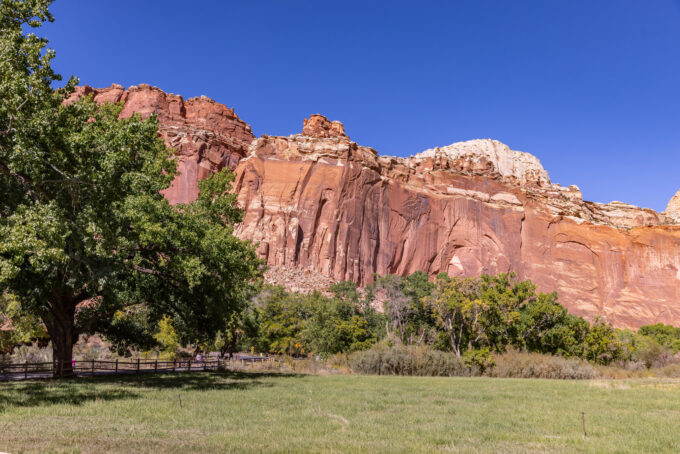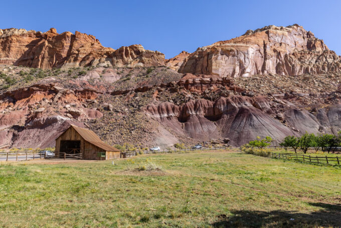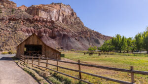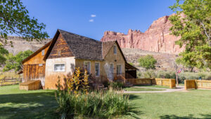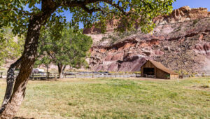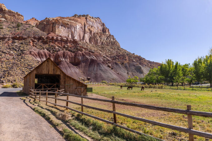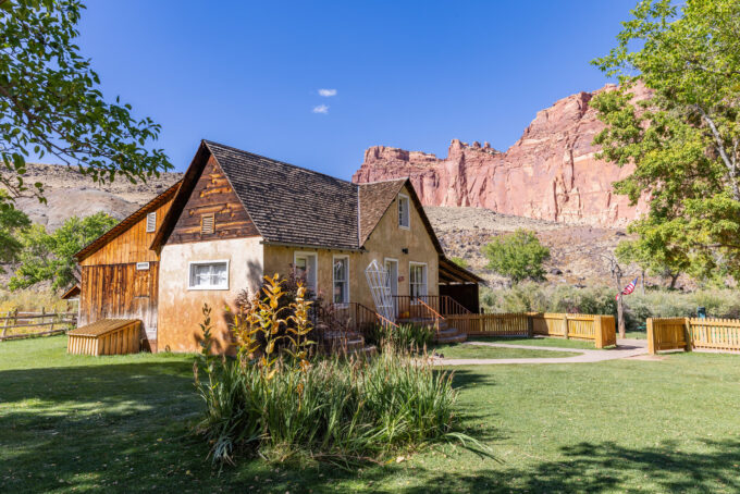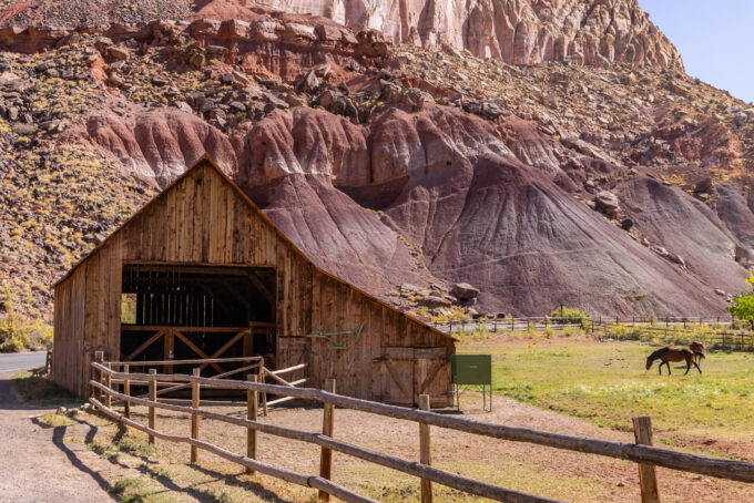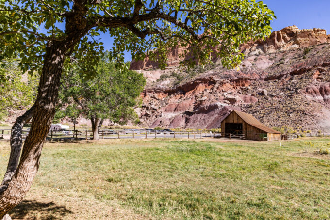 Pierwszym przystankiem był Visitor Center w Fruita – historycznej osadzie mormonów, która stanowi serce parku. Otrzymałem tam mapy i rekomendacje od rangerów, którzy polecili kilka szlaków dostępnych o tej porze roku. Uwagę przykuły również sady owocowe, które – co ciekawe – są do dziś utrzymywane i w sezonie można zrywać owoce za darmo (lub za symboliczną opłatą, jeśli zbieramy więcej). Niestety sezon owocowy się już zakończył, a główna droga w parku czyli Scenic Drive była zamknięta z powodu remontu.