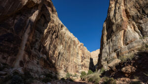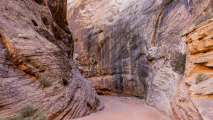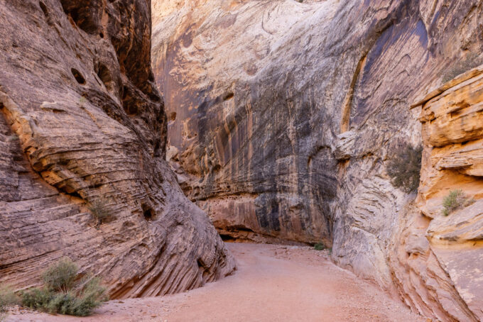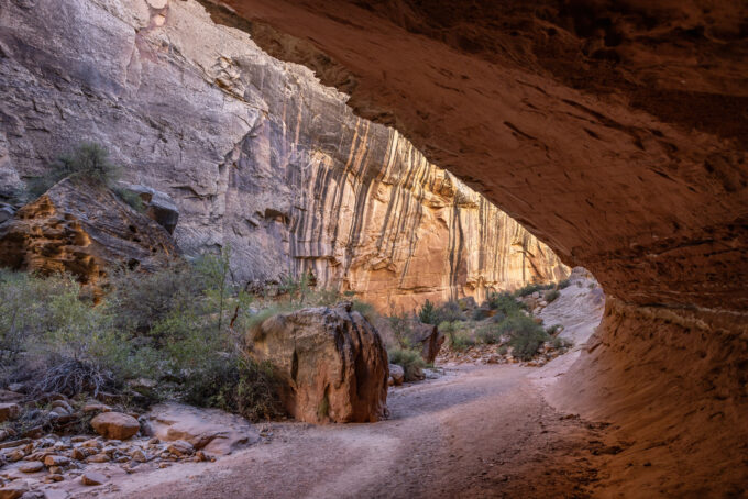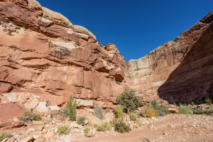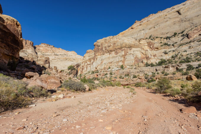 Nie mieliśmy całego dnia na zwiedzenie parku, więc musieliśmy się skupić na jednej z jego atrakcji. Było gorąco i wędrowanie po szlakach było dość trudne, ale zdecydowaliśmy się na przejście pieszo szlakiem Grand Wash trail, który wije się po dnie kanionu otoczonego z obu stron ogromnymi klifami. Było ciepło, ale wysokie skalne urwiska dawały też sporo cienia, z którego korzystaliśmy. Doszliśmy aż na początek szlaku do Cassidy Arch.