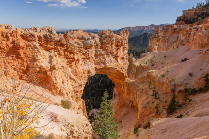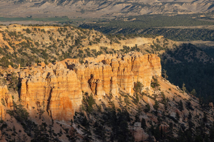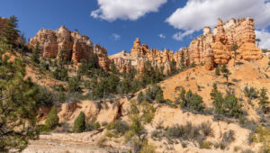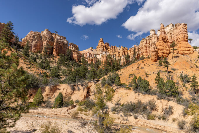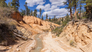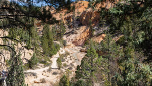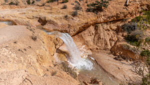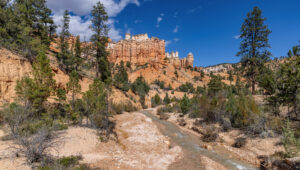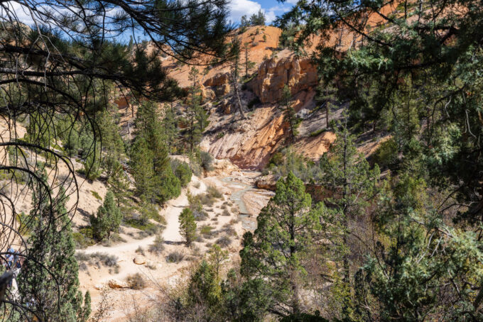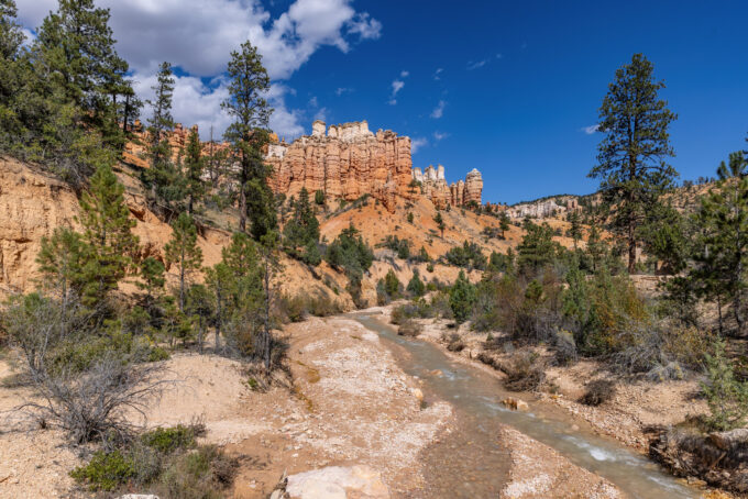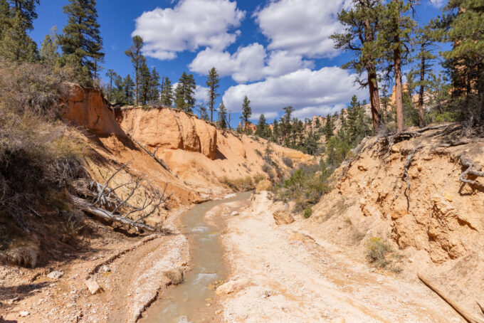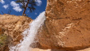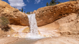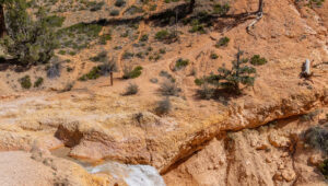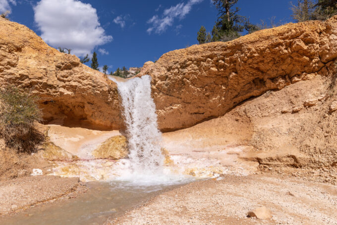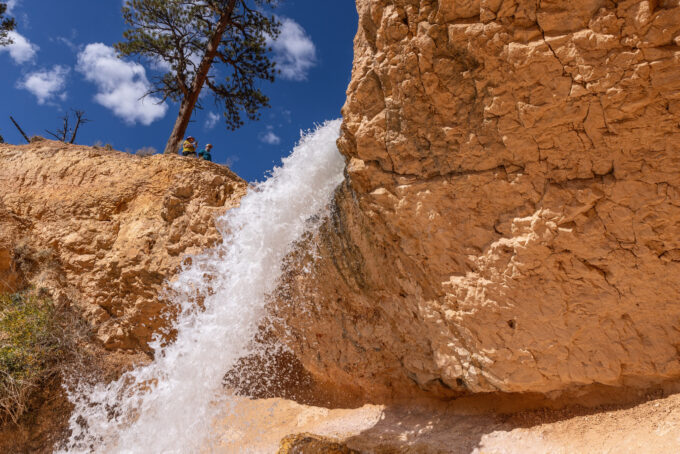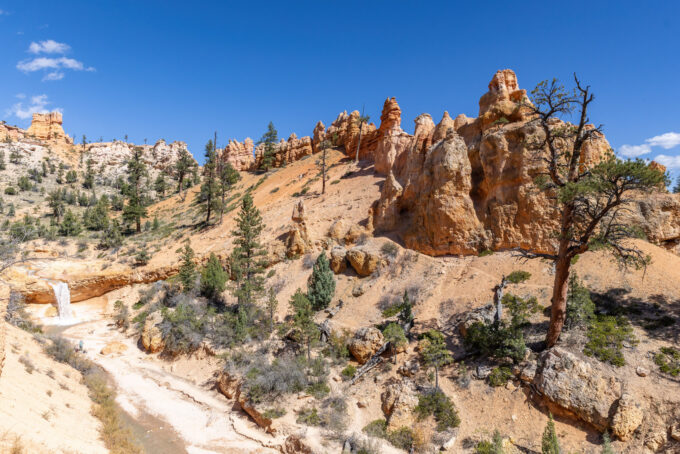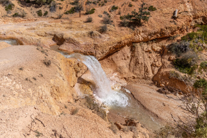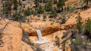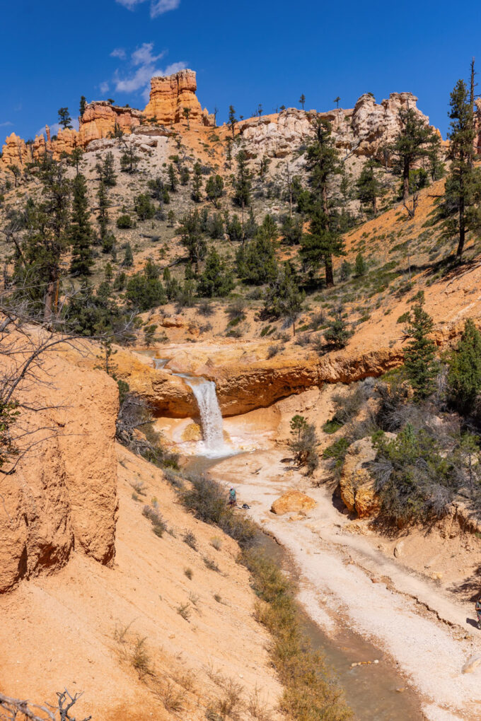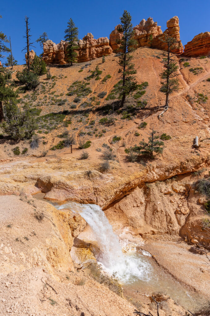 Do Bryce Canyon dotarliśmy przed południem. Słońce było już wysoko, ale chłodne powietrze przenikało przez warstwy sosnowych lasów, które otaczają wyższe partie parku. Wjazd do parku prowadzi przez lasy pełne dzikiej przyrody – już po chwili dostrzegliśmy pasące się mulaki. Zaczęliśmy standardowo od Visitors Center, ale później udaliśmy się w mniej uczęszczaną część parku, czyli do Water Canyon i Tropic Ditch Falls. Wędrówka z parkingu zajęła może 20 mint, aż dotarliśmy do przepięknego, niewielkiego wodospadu lejącego się po pomarańczowych skałach.