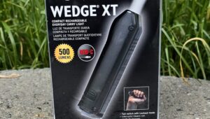 To, co odróżnia Wedge XT od większego modelu, to także sposób obsługi. Włącznik znajduje się z tyłu. Domyślnie pojedyncze wciśnięcie uruchamia tryb wysoki, a podwójne – niski. Jednak dzięki systemowi TEN-TAP®, dziesięciokrotne, szybkie naciśnięcie włącznika pozwala zamienić tę kolejność. W Wedge XT znajdziemy także drugi flagowy system Streamlight, czyli FIVE-TAP®. Umożliwia on, po pięciokrotnym naciśnięciu, zablokowanie latarki, by przypadkowo nie włączyła się w kieszeni lub plecaku.
