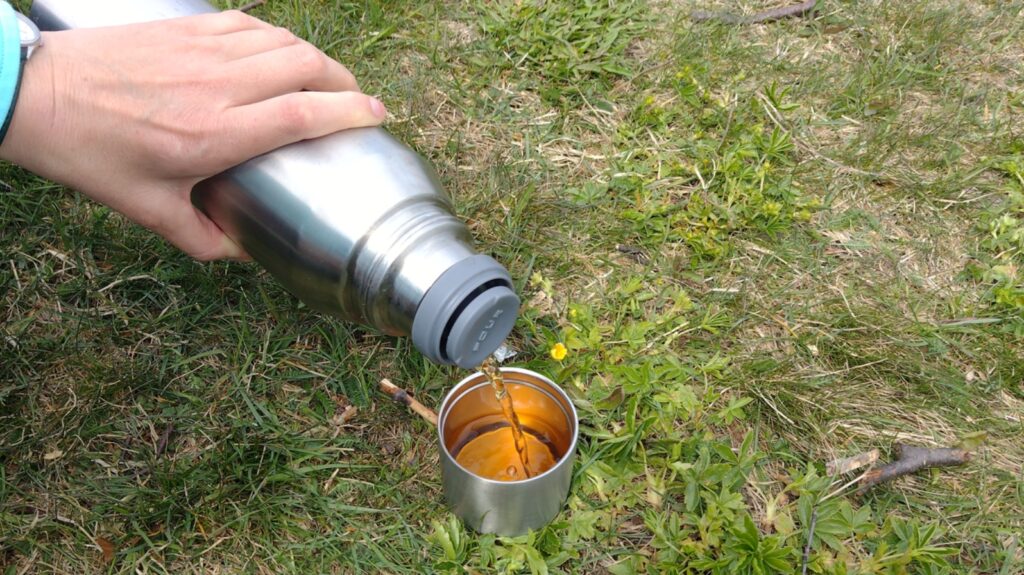 Według specyfikacji producenta temperatura napoju spada o 4°C co dwie godziny. Po dobie napój powinien nadal mieć temperaturę w okolicach 60°C. Podczas trasy kilkakrotnie raczyłam się herbatą z termosu – przy czym korzystałam z tradycyjnej nakrętki, więc napój był narażony na wychłodzenie podczas otwierania i nalewania. Po długiej wędrówce zostało mi trochę herbaty i faktycznie następnego dnia była ona nadal lekko ciepła.