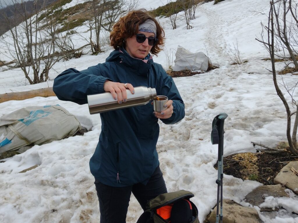 Galaxy jest solidnym termosem na górskie wyprawy, który zmieści się w kieszeni bocznej plecaka. Ja spakowałam go do komory głównej plecaka w związku z tym, że wędrowałam wczesnowiosenną porą i miejscami śnieg jeszcze pojawiał się na trasie w Bieszczadach.