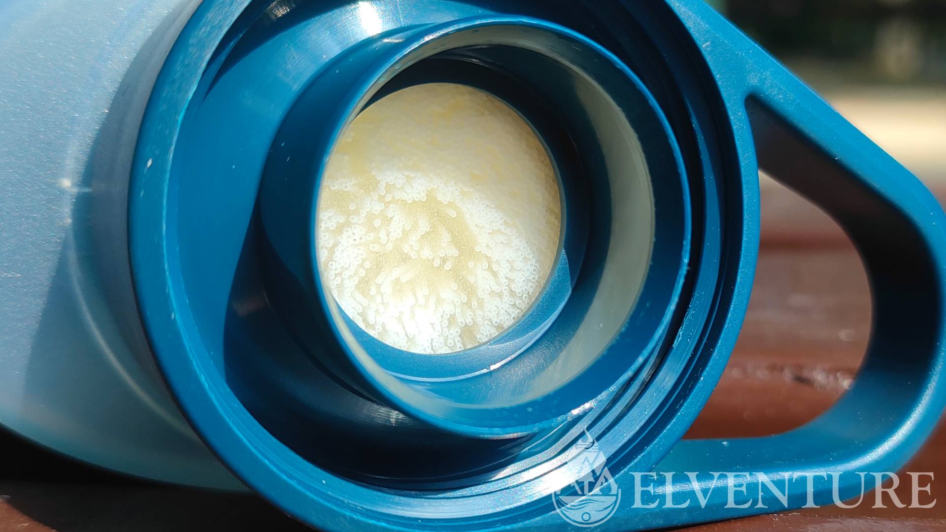 Przepływ, nawet z filtrem węglowym, okazał się w zupełności wystarczający do wygodnego picia. Nie podtapiałem się ani nie dostawałem żylaków za uszami od ssania ustnika. Pod względem ergonomii samego picia – zero zarzutów. Korek zaklikuje się pewnie i szczelnie, ale bez większego problemu daje się otworzyć, nawet mokrymi dłońmi.