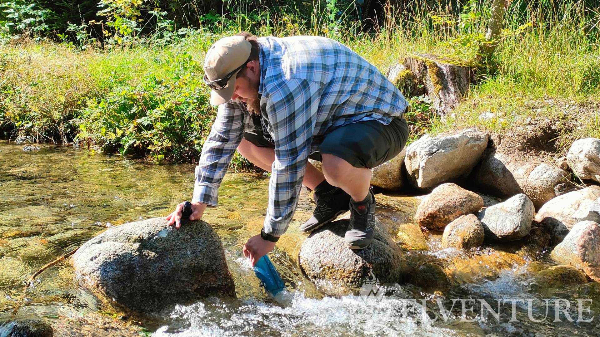 W końcu nieopodal szlaku natrafiłem na ładny potoczek, a idąc kawałek w górę biegu, natrafiłem na dogodny brzeg, a nawet kilka stabilnych kamieni w wodzie. Bez zbędnej zwłoki zatankowałem butelkę do pełna – szeroki wlew pozwolił zrobić to w kilka sekund. Woda była… cóż, smaczna. Czy bez filtra również? Nie wiem, nie próbowałem. Jeszcze 20 lat temu bez oporu bym zaczerpnął do dłoni i pił wprost ze strumienia, ale planeta nam się trochę zaśmieciła od tego czasu. No i nie wiadomo, czy gdzieś dalej nie leży w wodzie jakaś gnijąca padlina. Tymczasem kilka tygodni później, pisząc te słowa, żyję, mam się dobrze, więc chyba filtr działa. Albo woda była czysta. A może jedno i drugie? Lepiej nie ryzykować testów na ludziach.