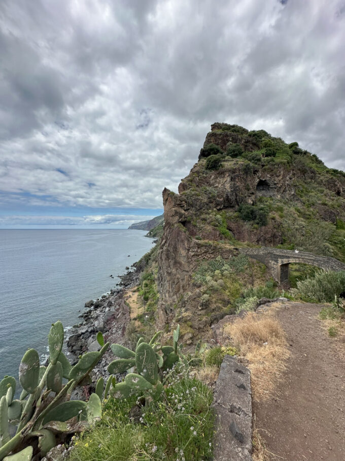 Przeszliśmy najpierw przez mokry (i śliski przez to) tunel, następnie przez Ponte do Caminho Real – ciekawy, kamienny mostek z zaokrąglonymi stopniami będący pozostałością starej drogi. Kolejnym punktem był widowiskowy łuk skalny z widokiem na ocean: idealne miejsce, jeśli chcemy mieć piękną fotkę. Pod warunkiem, że akurat nie będzie turystów. Na trasie pozostał jeszcze samoobsługowy sklep z bananami pochodzącymi z pobliskiego sadu i nasz wodospad.